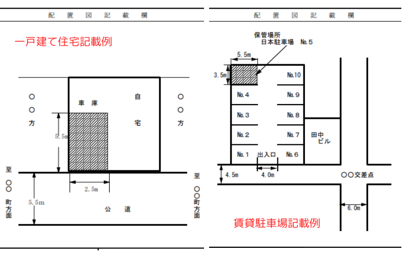 賃貸駐車場やアパートの駐車場等の場合は下記記載例の右の図のように記載します。
