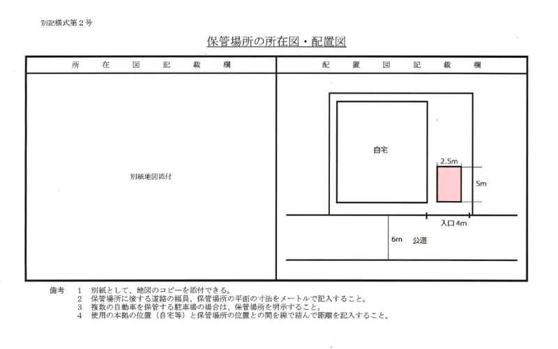 保管場所の所在図・配置図とは 保管場所の所在図・配置図とは、自宅から駐車場の位置関係、駐車場及びその付近の位置関係を示す書類です。 用紙は、こちらからダウンロード…