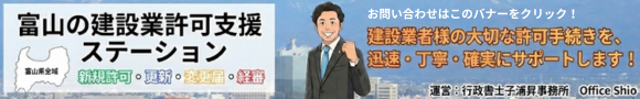 富山県での建設業許可の新規取得・更新手続きでお困りの方は、ぜひ当事務所へお気軽にご相談ください。
