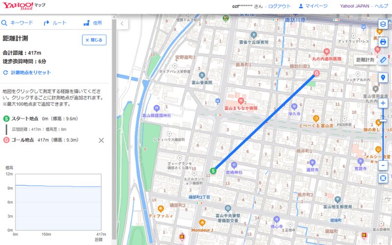 次はそのまま保管場所の位置にカーソルを合わせてクリックすると、ゴール地点のGマークが付いて直線距離が測れます。