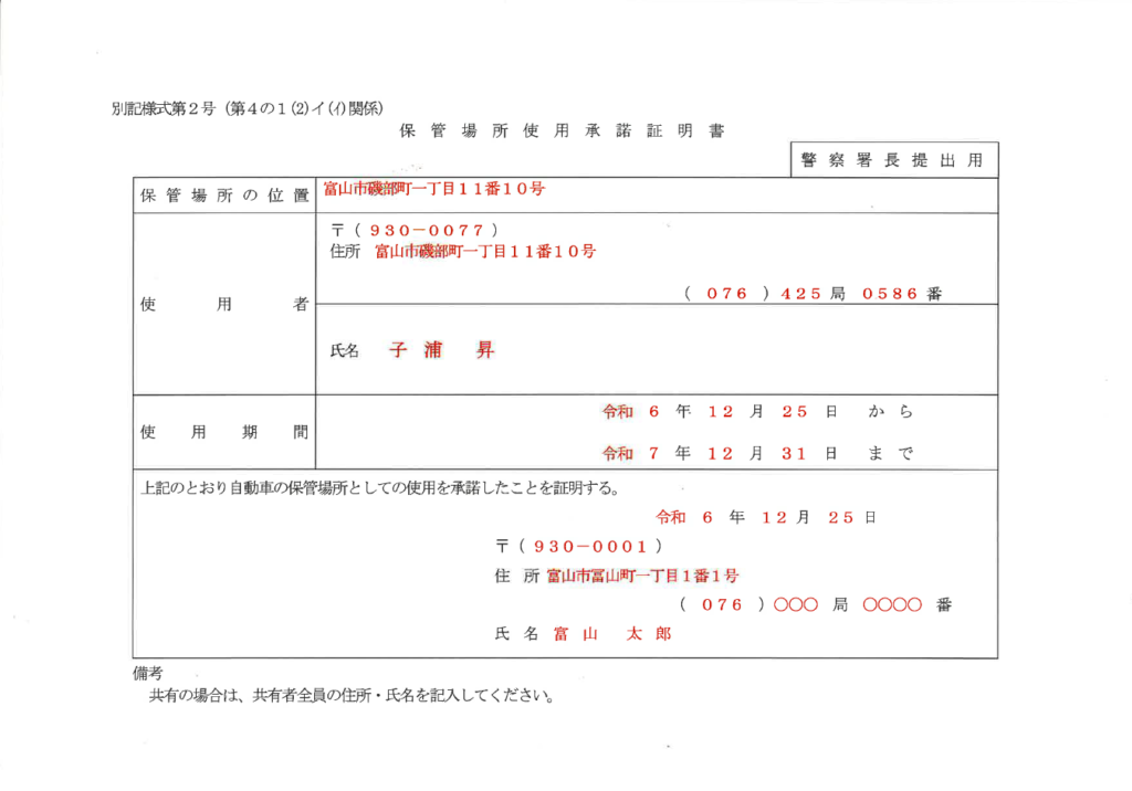 保管場所使用承諾証明書には、下記の記載例の赤い箇所を記入します。