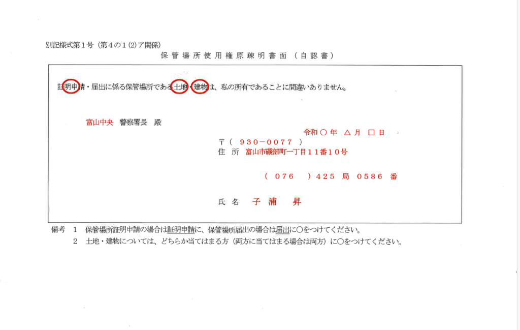 - 保管場所の位置(住所のみ)※建物名・部屋番号があっても記載しない。